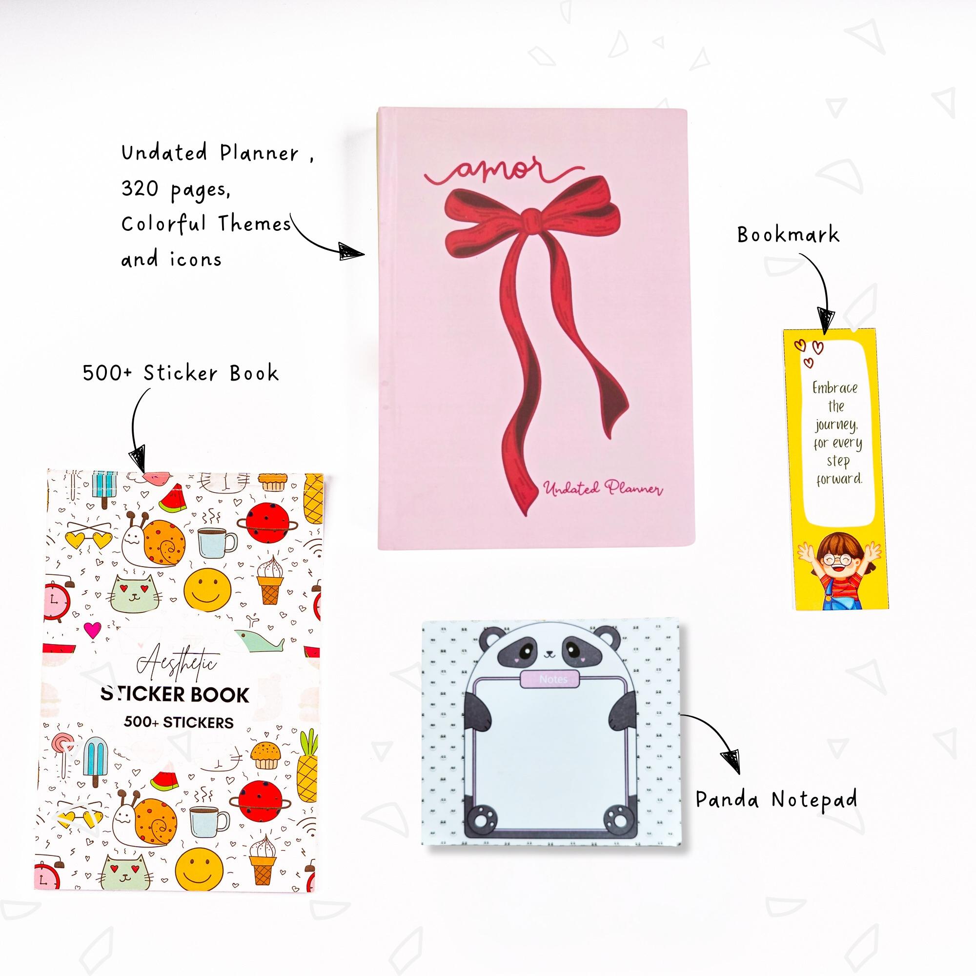 Amor – Undated Planner Combo| 320 pages Matte laminatation Undated Planner|100 GSM| 500+ Aesthetic non tearable Sticker book|FREE BOOKMARK | FREE PANDA MINI NOTEPAD |Weekly Ajenda,Monthly view,Sleep tracker,Habbit tracker,Medication Tracker,Budget planning | 15cm x 23cm