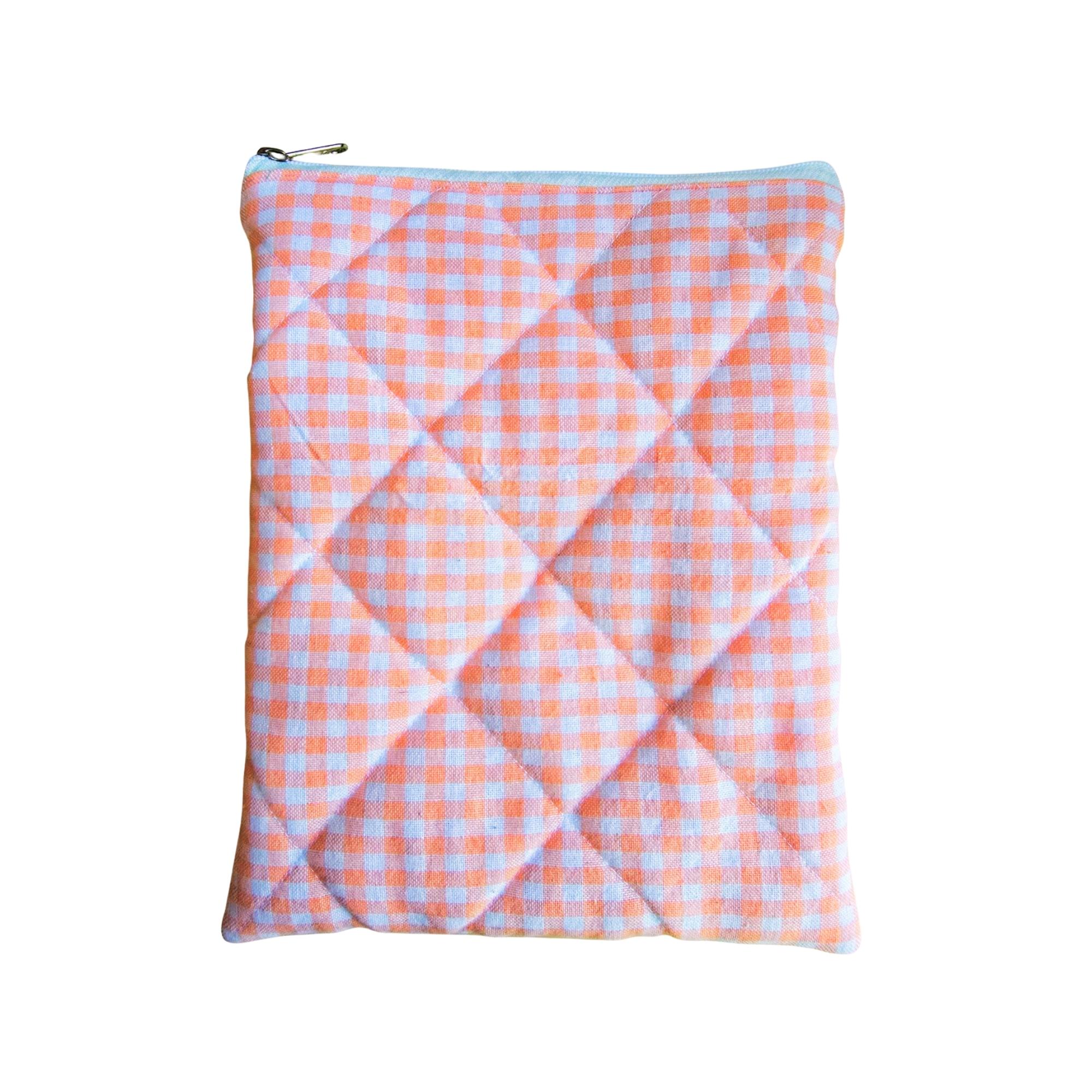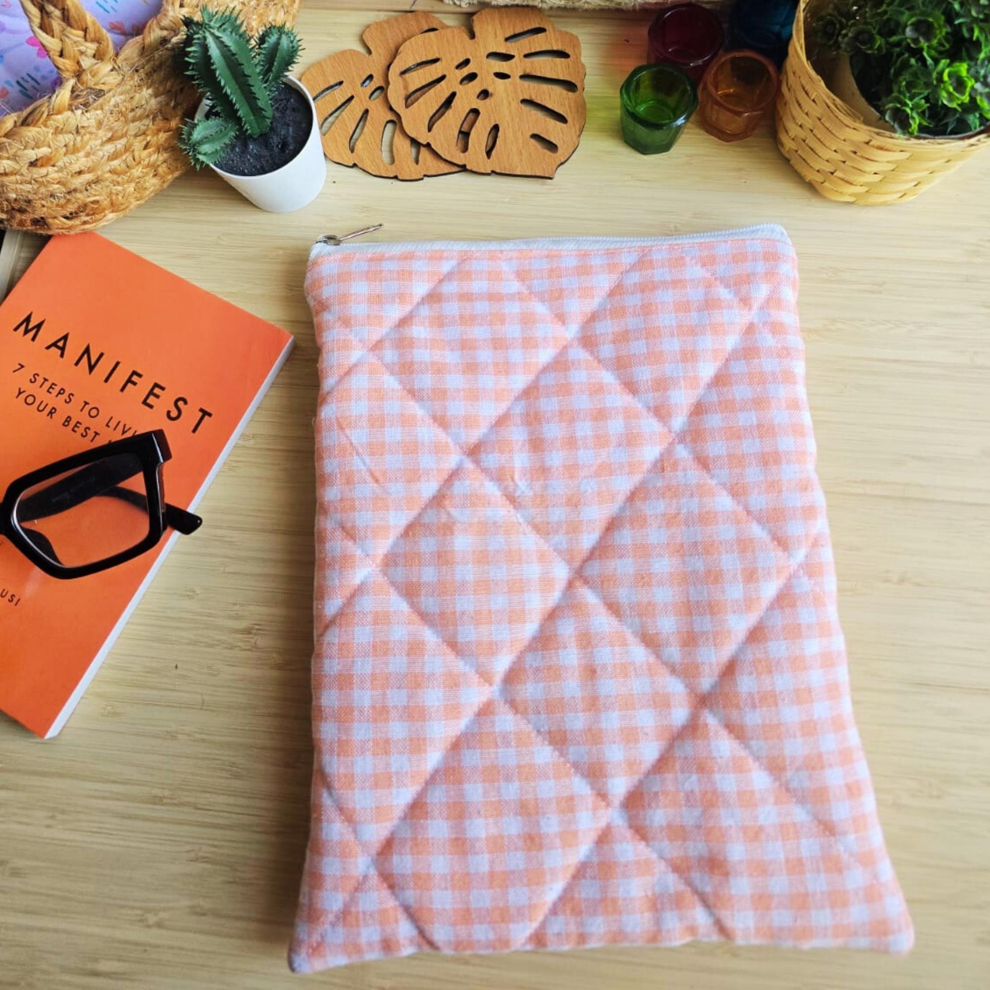 Handcrafted Quilted Peach Checkered Printed 100% Cotton Fabric Book,Tablet,Ipad Sleeves | Multicolor | padded inner lining | Washable Foaming Sheet | Padded Multipurpose Pouch/bag/tablet,ipad cover/Book Covers/Book Protector| Zip closure – 9 Inch x 11 Inch