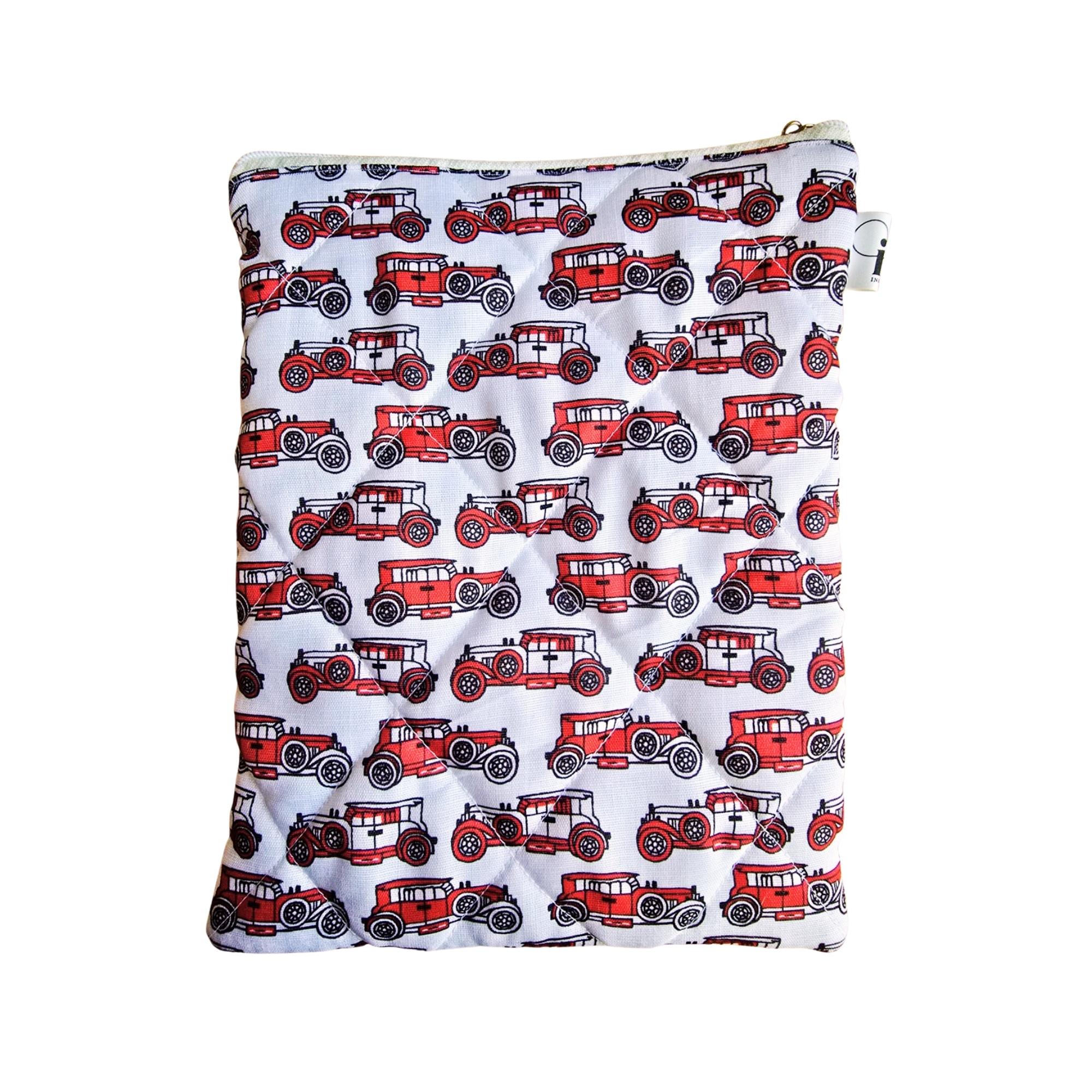 Handcrafted Quilted Red Car Printed 100%Cotton Fabric Book,Tablet,Ipad Sleeves | Multicolor | padded inner lining | Washable Foaming Sheet | Padded Multipurpose Pouch/bag/tablet,ipad cover/Book Covers/Book Protector| Zip closure – 9 Inch x 11 Inch